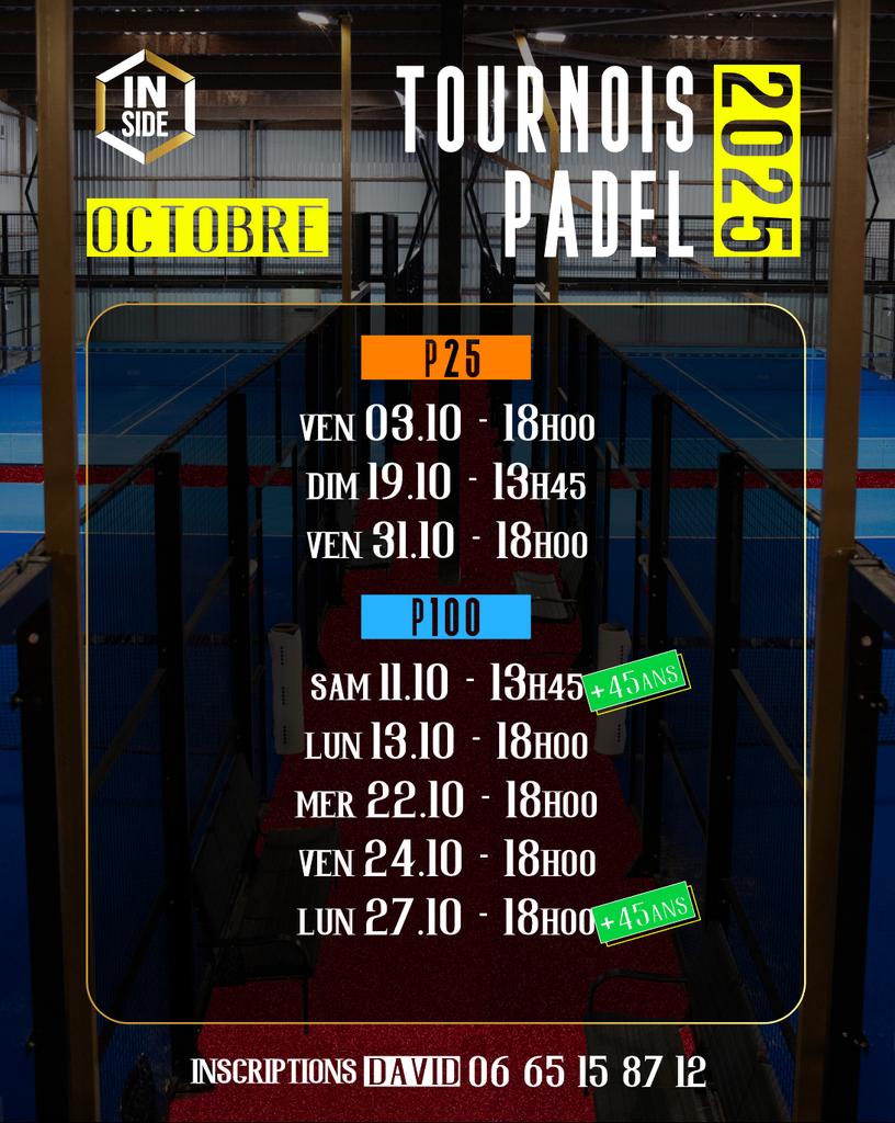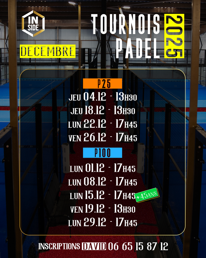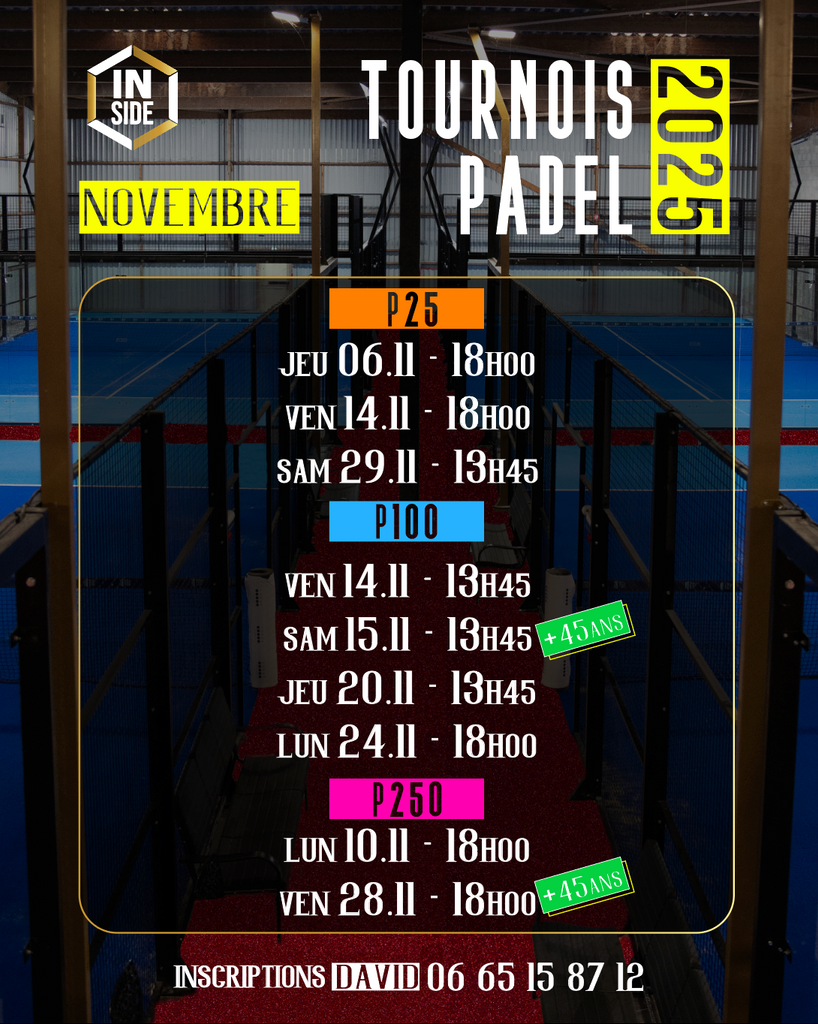 Découvrez le planning des prochains tournois de Padel-Tennis à l'Inside Sport Reims. P25, P100 et P250 au programme.